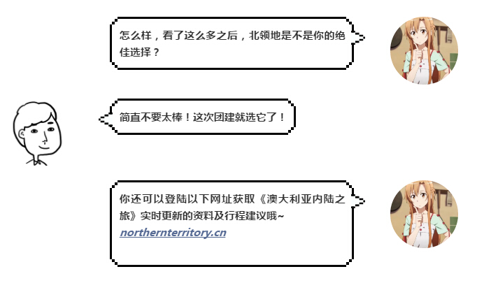 澳大利亞北領地不同于任何地方。探訪此處,你的團組將會收獲包羅萬象的團建體驗,既能感受大自然的粗糲和狂野,也能嗅到這塊美麗又炎熱的內陸地區獨具魅力的溫柔和甜蜜。在北領地,人文與自然交織在一起,你的團組將會收獲最強烈的視覺沖擊和最熱烈的內心悸動!